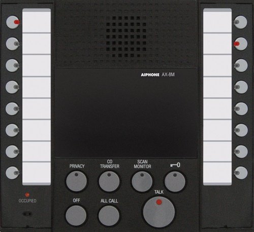 The AX-8M is an Audio only master station and can be one of the up to 8 masters supported in the AX Integrated Audio & Video Security system. Each AX-8M master station can initiate and answer calls from up to 7 additional master stations and up to 8 d